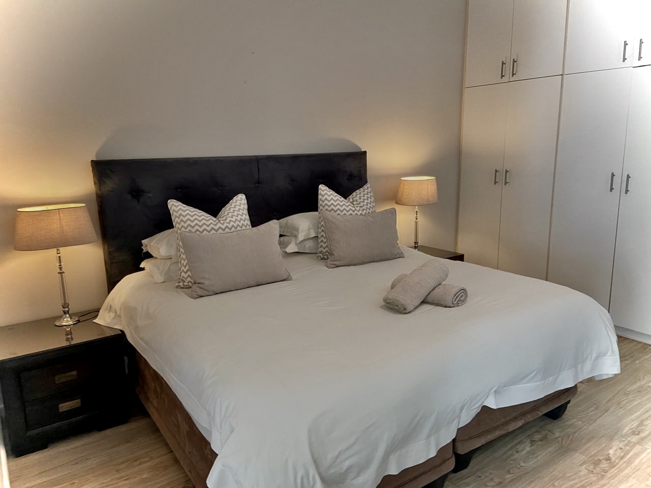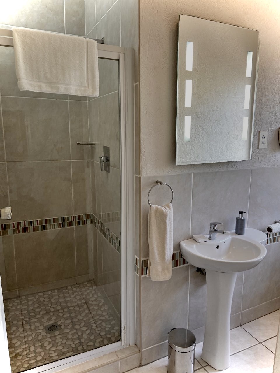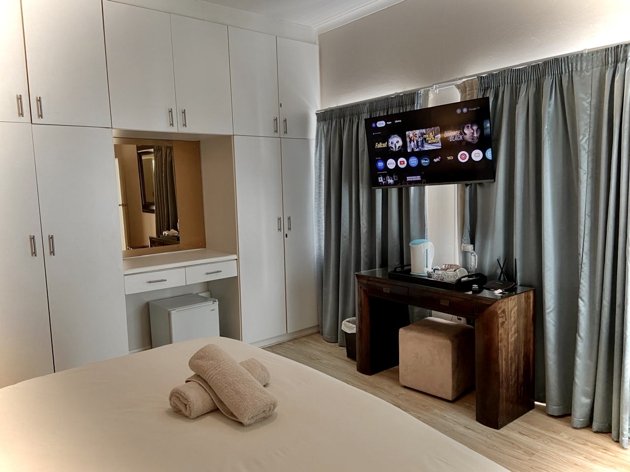 A king size bed that can be converted into two single beds. This suite features two comfortable chairs, console, flatscreen TV, DSTV and wall safe. Complimentary coffee/tea facilities and a bar fridge. The modern ensuite bathroom consists of shower facilities only, illuminated mirrors, make-up mirror, hairdryer and personalized bathroom amenities.